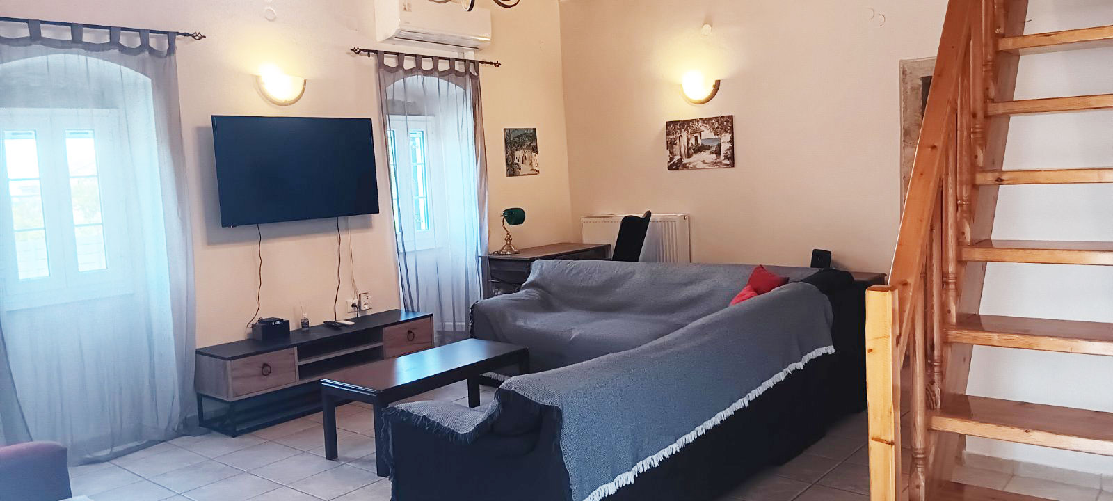 The villa features two comfortable bedrooms, a living room, a fully equipped kitchen and one bathroom, making it an excellent choice for couples, families or small groups. Outdoors, the property is surrounded by a garden, traditional courtyards and a private swimming pool, offering lovely spaces for sunbathing, outdoor dining and quiet moments under the shade of mature trees. Amenities such as air conditioning, free Wi-Fi, TV and private parking help ensure a comfortable and easy stay.